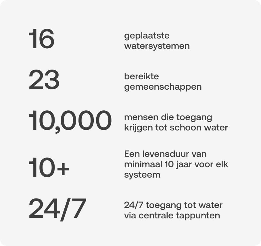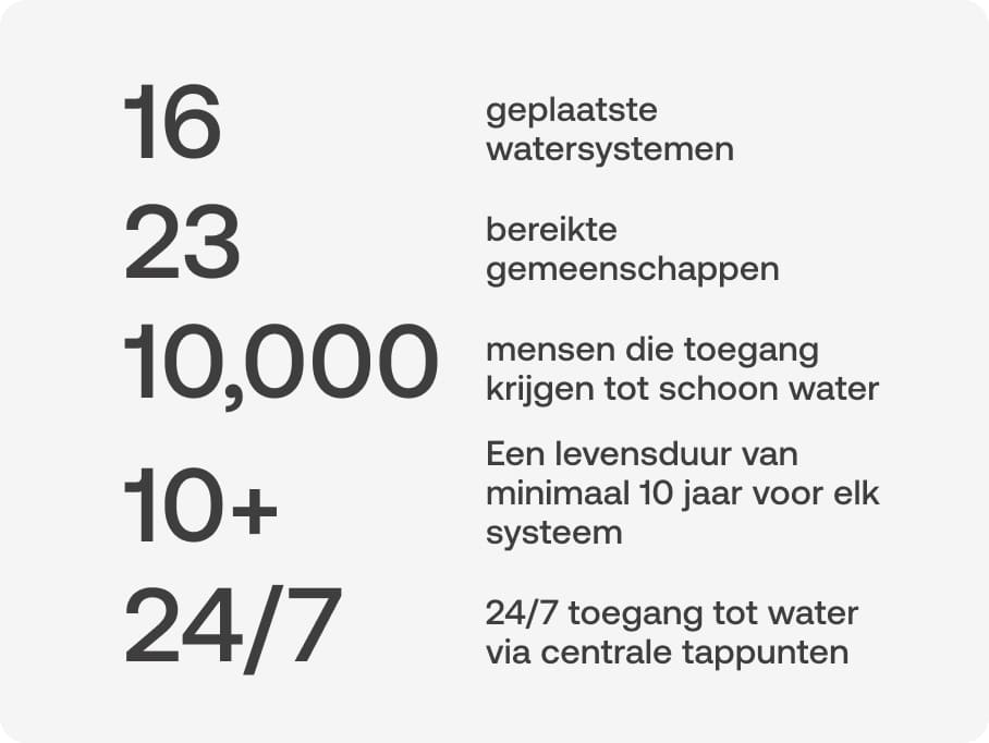 Op 31 maart 2025 zullen meer dan 10.000 mensen via dit initiatief toegang hebben tot schoon water. Elk tappunt vertegenwoordigt gezondere families, sterkere gemeenschappen en een duurzamere toekomst. Het bewijst dat een duurzame impact begint met kleine stappen, maar leidt tot grootse resultaten. We helpen gemeenschappen opbloeien, een dorp en een tappunt per keer.
